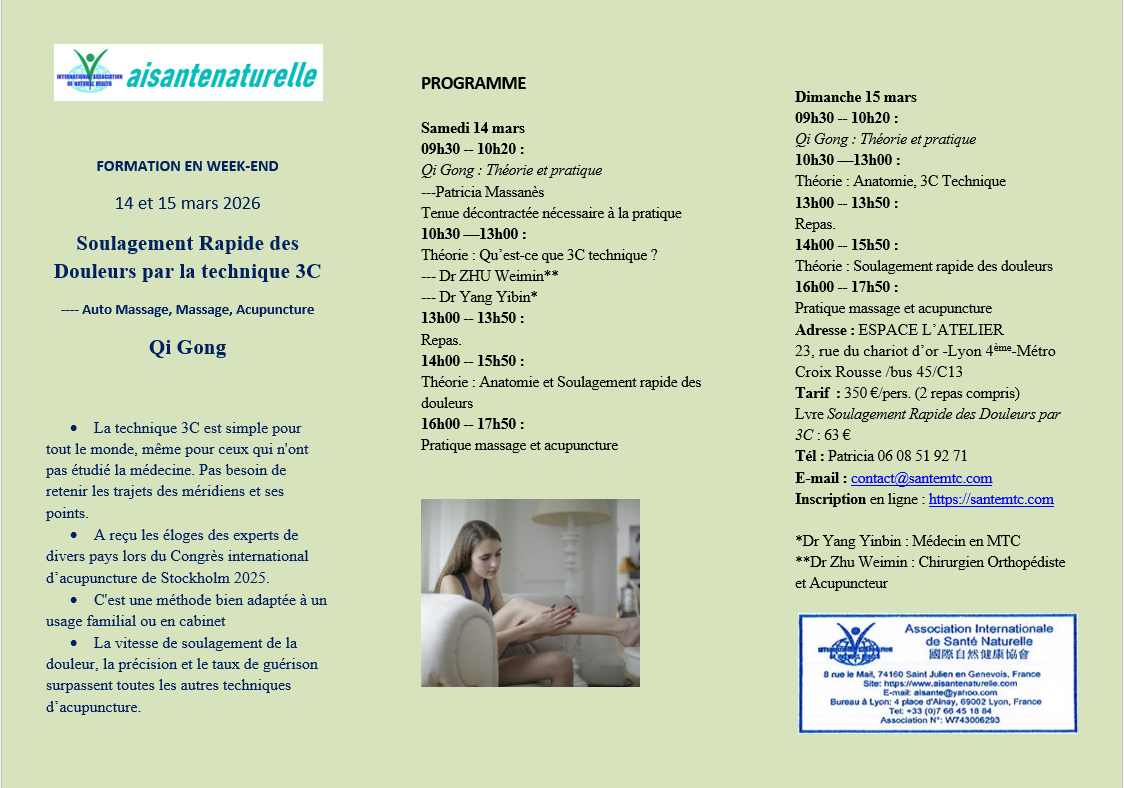 Le frais de formation, soit 350 €, sera réglé sur place le jour de la formation. Si vous n'avez pas de livre Soulagement Rapide des Douleurs par 3C, veuillez acheter ce livre avant de participer la formation sur notre site : https://santemtc.com.