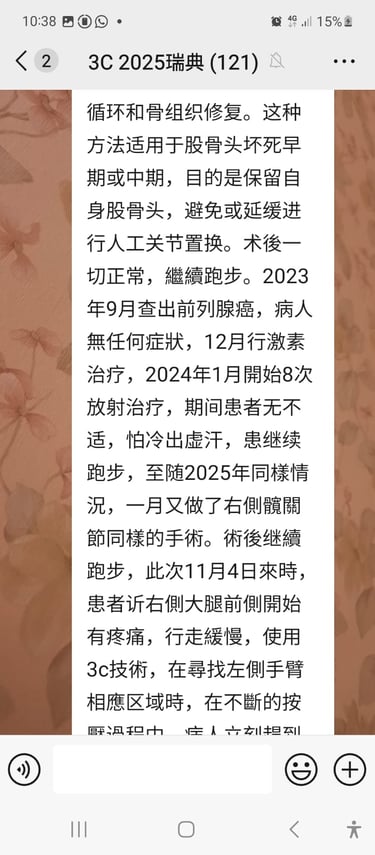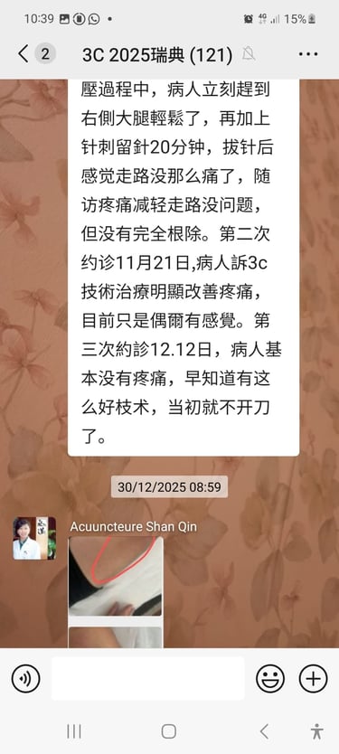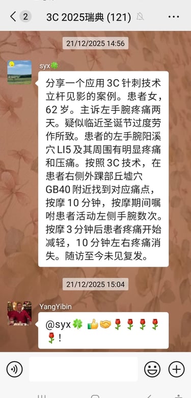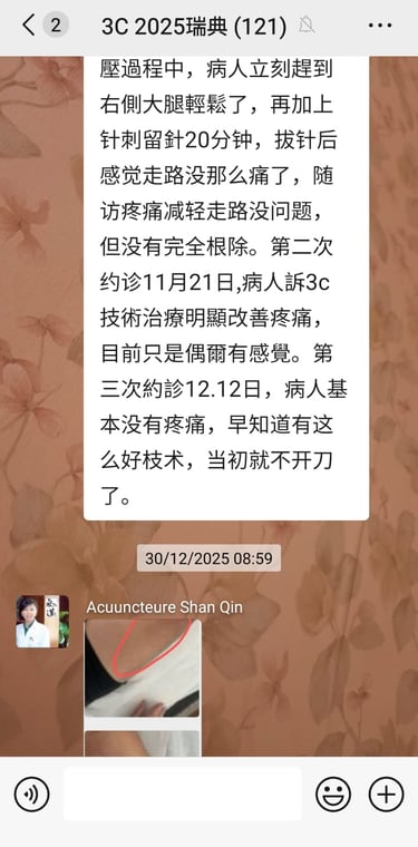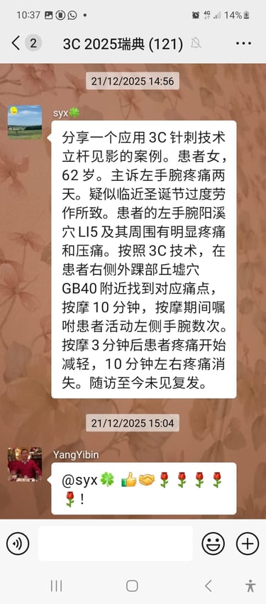 Il semble que la technique 3C puisse traiter non seulement divers types courants de douleurs, mais aussi certaines douleurs inhabituelles. Travaillons ensemble pour diffuser et développer la technique 3C.