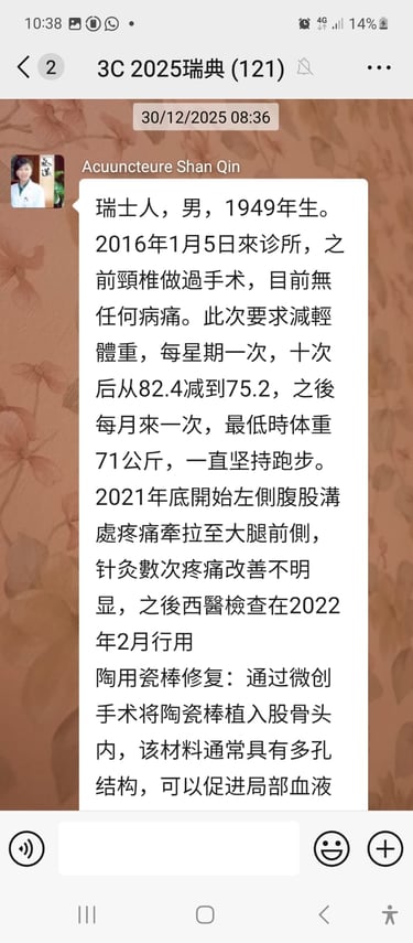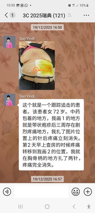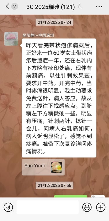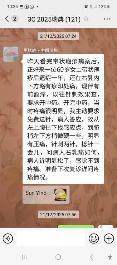 La patiente, une femme de 34 ans, masseuse en France, est venue deux fois à ma clinique, les 3 et 18 novembre. Elle signalait une fatigue chronique, un mauvais sommeil, des douleurs du cou et des épaules, une douleur à l’épaule droite et des douleurs cervicales, toutes liées à son travail. Elle mentionnait également des règles abondantes avec caillots, et des douleurs abdominales pendant les menstruations, qu’elle attribuait aux habitudes alimentaires françaises — consommation fréquente de boissons froides pendant les repas, entraînant du froid et de l’humidité internes, ainsi qu’une stagnation du qi et du sang. Grâce à la technique 3C, après environ une heure de traitement, toutes ses douleurs avaient disparu. Pour ses douleurs menstruelles, je lui ai prescrit des pilules de Tao Hong Si Wu Tang et fixé un rendez-vous de suivi pour le 18 novembre.