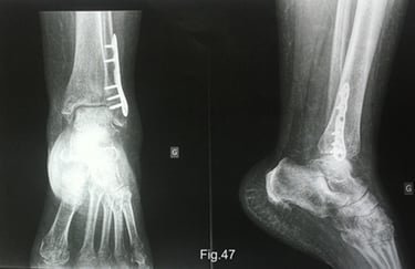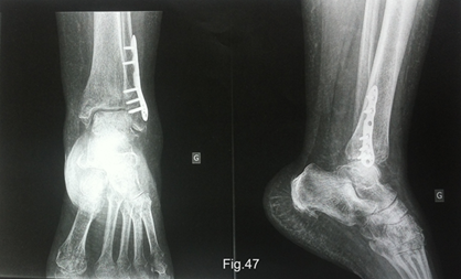 La radiographie montre que la fracture de la malléole externe est consolidée. Cependant, des signes d'ostéoporose pommelée (trabéculaire en forme de bulles) sont visibles dans le pied, c’est un signe typique de l’algodystrophie (Fig.47). Son chirurgien lui a prescrit une scintigraphie osseuse, avec un rendez-vous prévu dans dix jours. La scintigraphie osseuse permettra de confirmer le diagnostic d’algodystrophie.