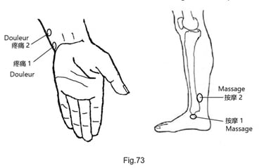 La radiographie n'a révélé aucune anomalie, mais la douleur persiste à cet endroit. En utilisant la technique des 3C (Fig.32), nous avons effectué un massage juste en dessous de la malléole interne (Fig.73, Massage 1). Après une minute de massage, la douleur au niveau du styloïde de l'ulna a disparu, mais elle s'est déplacée vers la région supérieure du col de l'ulna (Fig.73 Douleur 2). Nous avons alors massé la zone située au-dessus et derrière la malléole interne (Fig.73 Massage 2). Une minute plus tard, la douleur avait complètement disparu. La mère du garçon a trouvé cela incroyable et a exprimé son intérêt pour en savoir plus. Je lui ai donné l'adresse du site web de notre association et l'ai informée de nos formations.