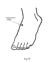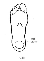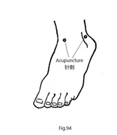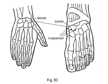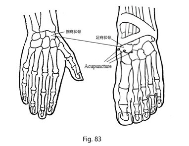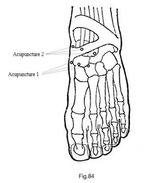 En suivant la technique 3C (Fig.30), on a localisé la zone correspondante au scaphoïde du pied gauche. Trois aiguilles ont été insérées autour de cette zone (Fig.83), ce qui a immédiatement atténué la douleur ; cependant, 10 minutes plus tard, la douleur persistait. Trois autres aiguilles ont été ajoutées près de l'articulation de la cheville (Fig.84) ; 10 minutes plus tard, la douleur au scaphoïde carpien avait disparu, mais une douleur était apparue au niveau du poignet. Lorsque le patient étendait son poignet et exerçait une pression, il ressentait une douleur au dos et à la paume du poignet.