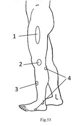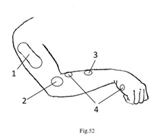 Le traitement a débuté par une manipulation cervicale, une méthode de réduction progressive de la hernie discale, sans claquement ni douleur, développée par le Dr Zhu Weimin. Environ 15 minutes après la manipulation, la douleur au niveau du cou a disparu, mais une douleur persistait sur la partie externe du bras droit (Fig.52-1). Trois aiguilles ont été insérées dans la partie externe de la cuisse gauche selon la méthode 3C (Fig.53-1), juste après les 3 aiguilles la douleur a déplacé au niveau de la partie externe du coude (Fig.52-2). Une nouvelle aiguille a été insérée sur la partie externe du genou gauche selon la méthode 3C (Fig.53-2), ce qui a provoqué un déplacement de la douleur vers la partie centrale de l'avant-bras droit, côté dorsal (Fig.52-3). Une autre aiguille a été insérée au milieu de la partie antérieure de la jambe gauche (Fig.53-3), la douleur s'est ensuite déplacée vers la main, au niveau de la face ulnaire du cinquième métacarpien, tout en se déplaçant également vers l'avant du coude (Fig.52-4). Après insertion d'une aiguille sur la face externe du cinquième métatarsien gauche, la douleur à la main a disparu. Une dernière aiguille a été insérée à l'arrière de la jambe gauche (Fig.53-4), éliminant complètement la douleur au niveau de la partie antérieure du coude droit. Cette traque et poursuite de la douleur a été longue, mais elle a finalement été couronnée de succès. Un suivi sur trois ans n'a révélé aucune récidive.