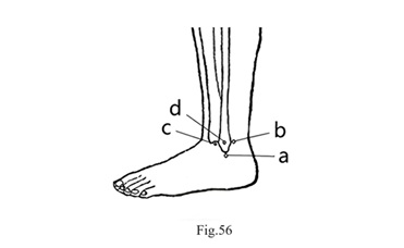 En suivant la technique 3C, une aiguille a été insérée horizontalement sur le dos de la première articulation tarsométatarsienne gauche (Fig.55). La douleur sur le côté dorsal de la première articulation carpo-métacarpienne droite a immédiatement disparu, mais une nouvelle douleur a commencé à apparaître au niveau du styloïde du radius droit (Fig.54-2), précisément à l'endroit où se développe souvent une ténosynovite de Quervain. Selon la technique 3C, une aiguille a été insérée sous la malléole externe gauche (Fig.56-a), mais cela n'a pas amélioré la douleur. Une seconde aiguille a été insérée à l'arrière (Fig.56-b), sans amélioration non plus, puis une troisième à l'avant (Fig.56-c), toujours sans effet. Théoriquement, la zone correspondant au styloïde radial devrait être le point le plus saillant de la malléole externe (Fig.56-d). Cependant, en raison de l'absence apparente de tissu mou dans cette zone, juste sous la peau se trouve l'os, ce point n'avait pas été choisi initialement. Comme la douleur persistait, ce point a finalement été testé. La peau au niveau du point le plus saillant de la malléole externe a été pincée entre l'index et le pouce, puis une aiguille a été insérée horizontalement, ce qui a immédiatement fait disparaître la douleur au niveau du styloïde radial. Il semble que le point "d" soit le véritable point correspondant. La technique 3C doit être suivie rigoureusement selon les principes établis, sans tenir compte des méridiens, des points