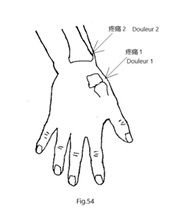 Douleur à la palpation au niveau de L5-S1, sans anomalies détectées dans les membres inférieurs. Douleur à la palpation des 2 côtés des T1 à T4, douleur marquée sur le dos de la première articulation carpo-métacarpienne de la main droite (Fig.54-1), sans déformation évidente.