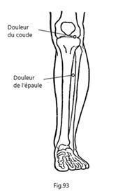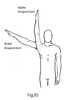 On a choisi le point de l'épaule selon la technique de Wang sur le membre inférieur gauche (Fig.93) pour le traitement par acupuncture. Après l'insertion de l'aiguille, la douleur a immédiatement diminué. En combinant avec des mouvements de l’épaule, l'aiguille a été laissée en place pendant 10 minutes. L'amplitude de mouvement de l'épaule est revenue à la normale, bien qu'il ressente encore une légère douleur. Selon la technique 3C, il est possible de sélectionner des points d'acupuncture au niveau de la hanche, on a cherché un point douloureux ou sensible mais on n’a pas trouvé. Dans ce cas à cause de la grande surface de cette région, il est difficile de localiser précisément les points. Par conséquent, nous avons choisi des points au niveau de la cheville du côté sain (Fig.94) pour le traitement ; C’est l’attaque en tenaille latérale. L'aiguille a été laissée en place pendant 20 minutes. Après le retrait de l'aiguille, la douleur a complètement disparu ; l'amplitude de mouvement de l'épaule était complète, avec abduction et antépulsion à 180° (Fig.95). Le patient, quelque peu incrédule, a demandé : "Est-ce que ma douleur pourrait être due à un problème psychologique ?"