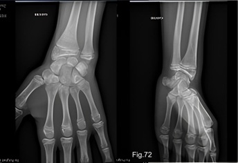 Un garçon de 14 ans s'est blessé au poignet gauche il y a deux semaines en soulevant un téléviseur lourd. La douleur se situe au niveau de l'apophyse styloïde de l'ulna, à l'endroit où il a subi une intervention chirurgicale un an auparavant. Il avait alors une fracture du radius distal avec une fracture du styloïde de l'ulna, qui a été réduite orthopédique et ostéosynthésée par broches de Kirschner. Après ablation des broches, tout s'était bien passé et il n'avait plus de problèmes (Fig.72). Cependant, il s'est à nouveau blessé à cet endroit il y a deux semaines.