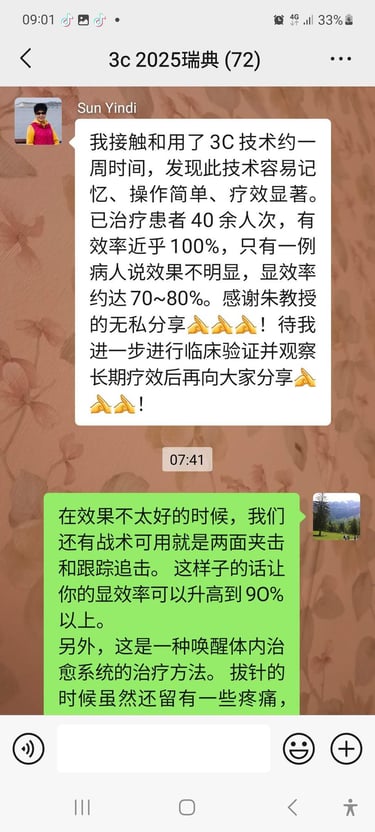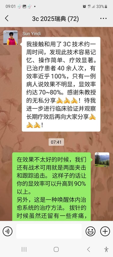 3C技术是通过按摩或针刺对患者疼痛部位的特定对应区进行刺激,从而实现迅速缓解甚至完全消除疼痛的方法。该技术是基于法国骨科医师、瑞士注册针灸师。朱卫民的多年的临床观察,发现人体存在一个“交叉与本体对应系统”,运用这一系统可以非常精准地锁定与疼痛相对应的点。 3C技术在临床应用中表现出独特优势:由于取穴精淮,一些疼痛在治疗过程中会出现“逃跑”现象,而3C技术能够对逃离的疼痛进行跟踪追击,直至完全消灭之。这在针刺史上尚属首次。 用这项新技术已经治愈了很多临床上的疑难痛症,有持续2年、四处求医无效的胸痛患者,有持续七年、四处求医无效的术后瘢痕疼痛患者、肠痛患者,有忍受了30年、在法国、瑞士四处求医无效的背痛患者,等等。来自20多个国家和地区的针灸师、按摩师在大会上对这一创新技术给予高度评价,认为其推广将显著提升针刺祛痛的整体临床效果。3C技术操作简便、疗效迅速,不依赖传统经络与穴位,为全球疼痛管理提供了全新的思路,与传统针刺及近年来流行的各类平衡针法相比,3C技术在疗效、速度、可操作性及痛点处理的精确度方面均展现明显优势。可以将您对疼痛治疗的满意度大幅度地提高。不少专家预期该技术将为未来疼痛治疗带来重要改变。 3C技术将在全球范围内推广,帮助更多患者摆脱疼痛困扰。多年来,经过法国杨谊斌医师、加拿大孙玉霞医师等多位临床针灸师的验证、实践 ,在斯德哥尔摩国际会议后,经过多国医生的检验,反馈可见”3C 2025瑞典”微信群截图: https://santemtc.com/3c-temoin