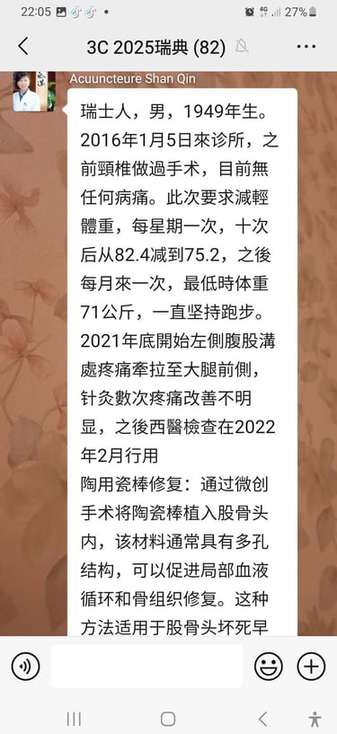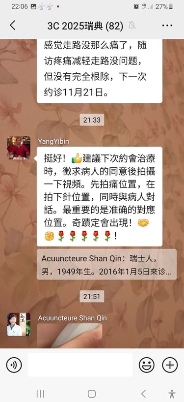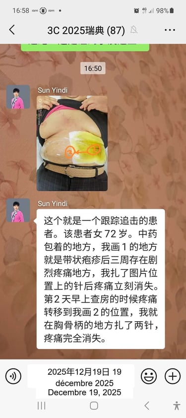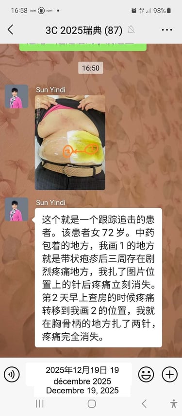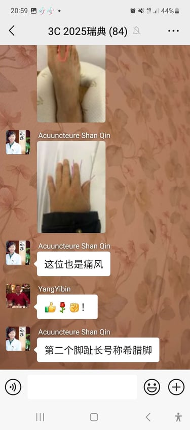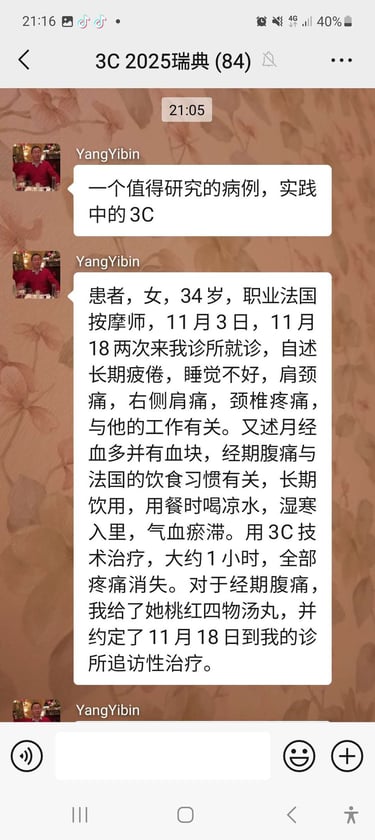 La patiente, une femme de 34 ans, masseuse en France, est venue deux fois à ma clinique, les 3 et 18 novembre. Elle signalait une fatigue chronique, un mauvais sommeil, des douleurs du cou et des épaules, une douleur à l’épaule droite et des douleurs cervicales, toutes liées à son travail. Elle mentionnait également des règles abondantes avec caillots, et des douleurs abdominales pendant les menstruations, qu’elle attribuait aux habitudes alimentaires françaises — consommation fréquente de boissons froides pendant les repas, entraînant du froid et de l’humidité internes, ainsi qu’une stagnation du qi et du sang. Grâce à la technique 3C, après environ une heure de traitement, toutes ses douleurs avaient disparu. Pour ses douleurs menstruelles, je lui ai prescrit des pilules de Tao Hong Si Wu Tang et fixé un rendez-vous de suivi pour le 18 novembre.