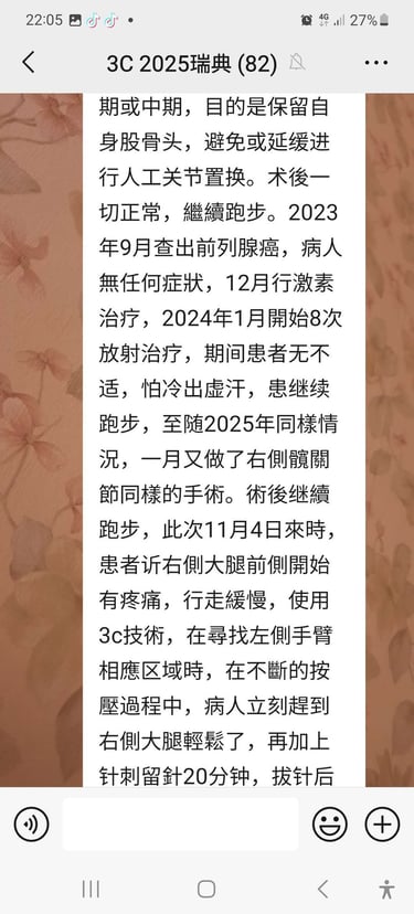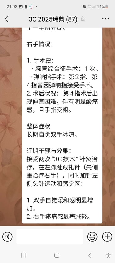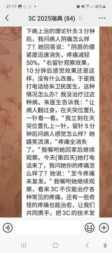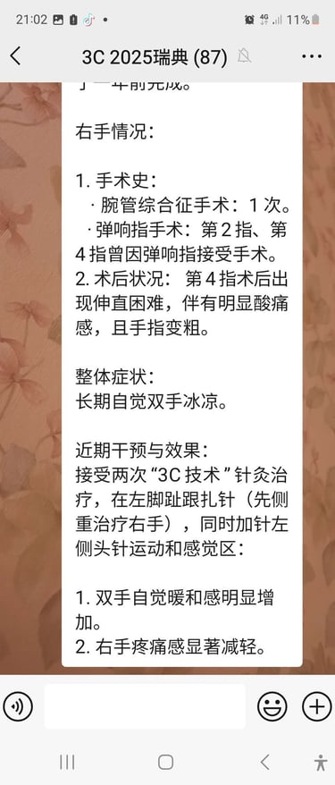 Il semble que la technique 3C puisse traiter non seulement divers types courants de douleurs, mais aussi certaines douleurs inhabituelles. Travaillons ensemble pour diffuser et développer la technique 3C.