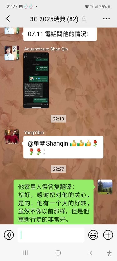 L’un d’eux, un jeune homme, avait une douleur à la deuxième articulation du majeur gauche et ne pouvait pas plier le doigt. J’ai immédiatement appliqué ce que j’avais appris en cours : j’ai inséré une aiguille dans le majeur de sa jambe droite. Lorsqu’il s’est relevé, il pouvait déjà étendre son doigt, sans douleur ! Il a été stupéfait par la rapidité du résultat… ! J’en ai profité pour lui présenter notre Professeur Zhu 👨🏫[Pouce levé][Rose][Sourire].