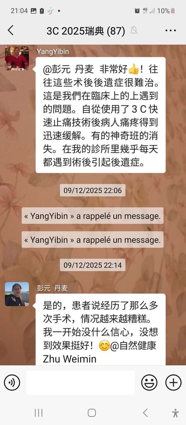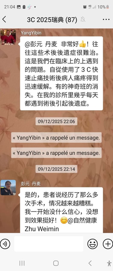 @Peng Yuan, — C’est vraiment très bien 👍 ! Souvent, ces séquelles postopératoires sont très difficiles à traiter. C’est un problème que nous rencontrons fréquemment en pratique clinique. Depuis que nous utilisons la technique 3C d’analgésie rapide, les douleurs des patients sont rapidement soulagées. Chez certains, elles disparaissent de manière presque miraculeuse. Dans mon cabinet, je rencontre presque tous les jours des séquelles dues à des interventions chirurgicales.